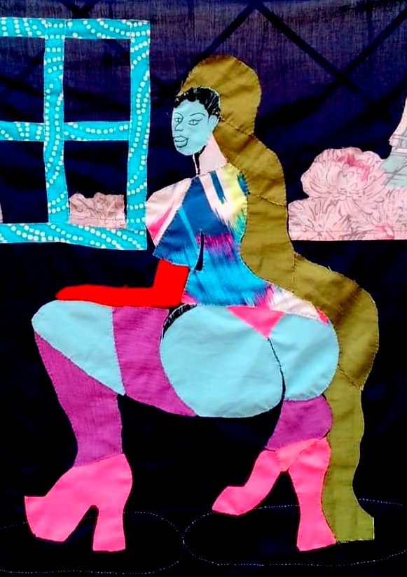 SD: Those bold colours have meaning. Yellow represents healing according to my spiritual belief. Blue is water, cleansing, and purity. Red is fire, passion, sometimes warning. I love how the colours light up the room (laughs). You can’t help but feel light looking at some colours, even though the subject matter might be heavy. But the first fabric determines everything, including the background. The background is the seal of the artwork. Once done, I have emptied myself of the ideas and energy for that piece.